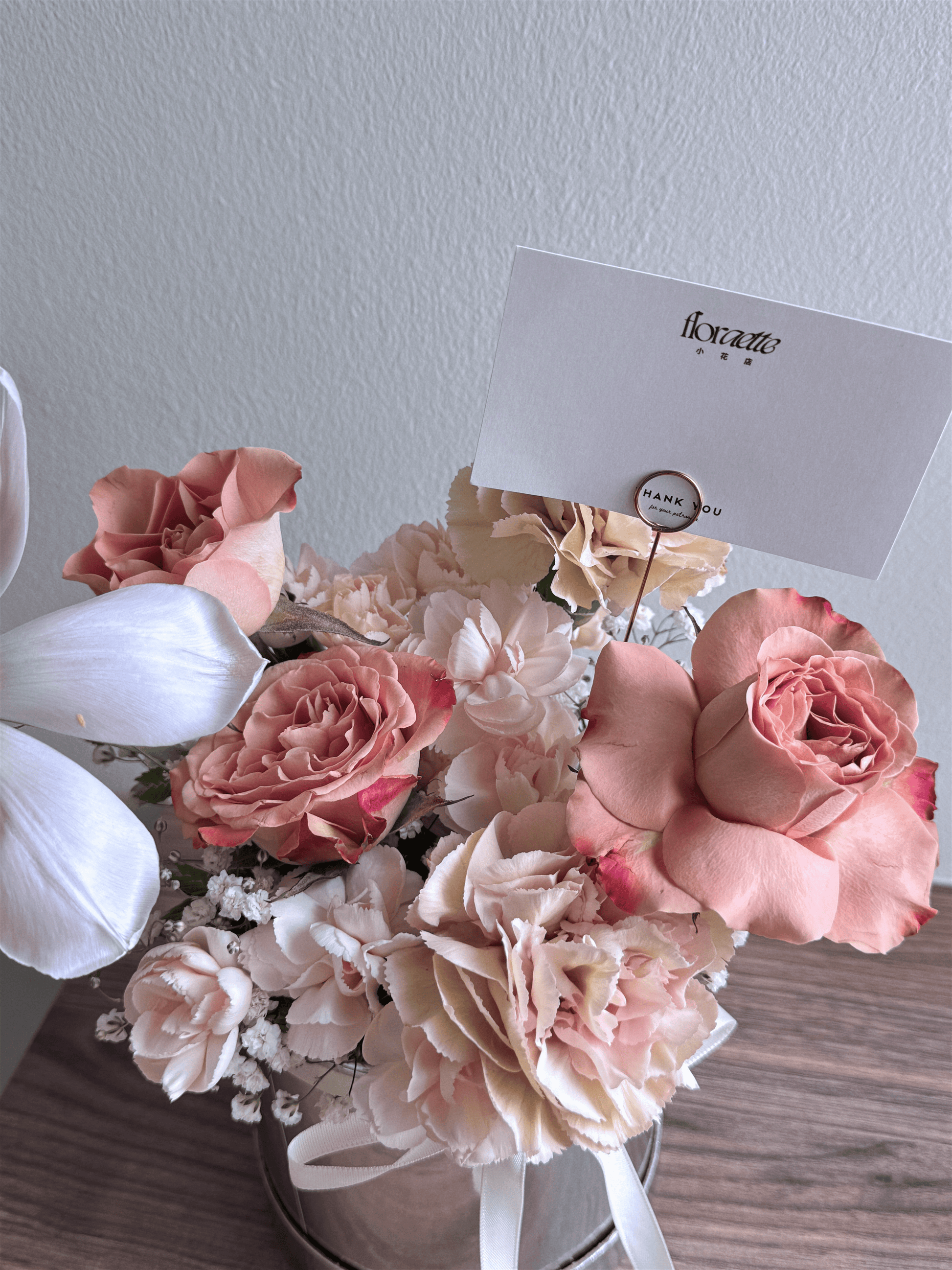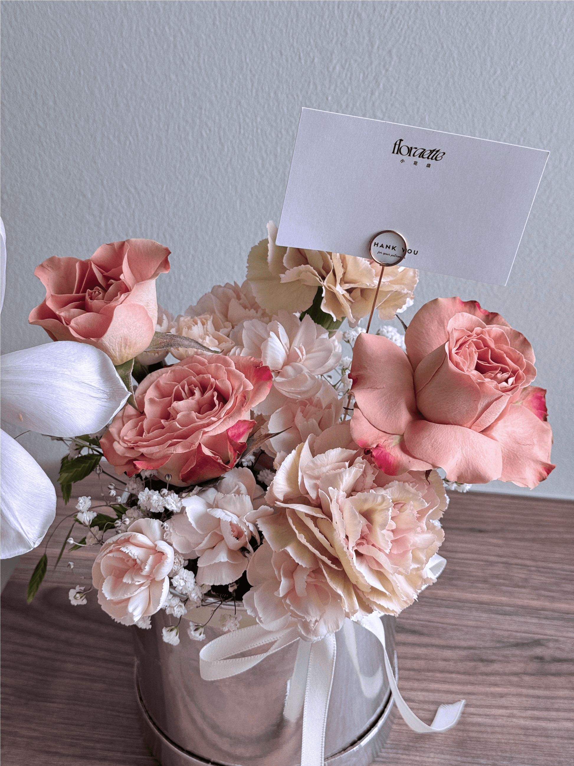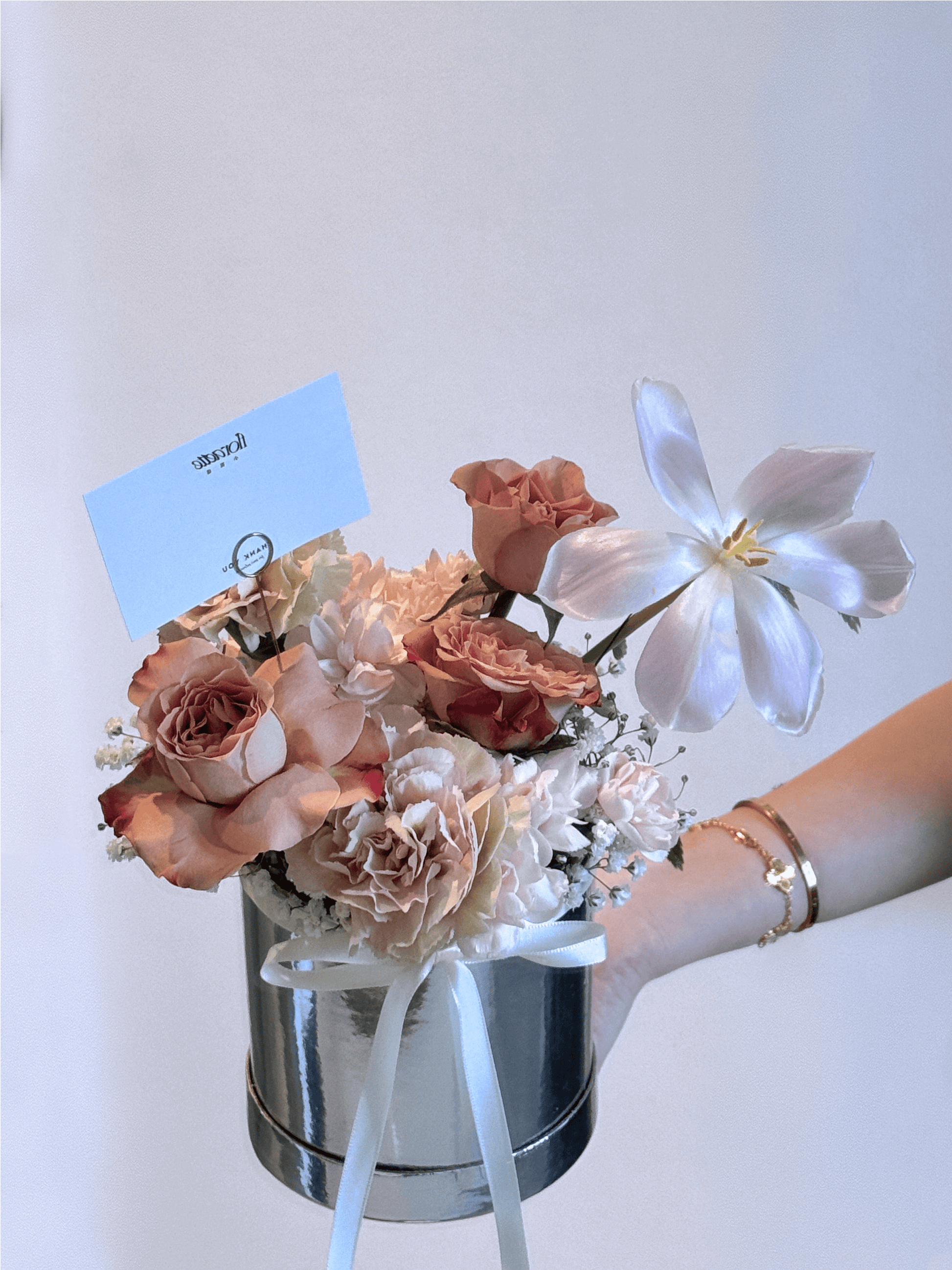 Discover the natural beauty of Blush Meadow in our Bloom Box. Experience the delicate hues of blush colours with premium cappuccino roses, caramel carnations, pink tulip, and baby breath.