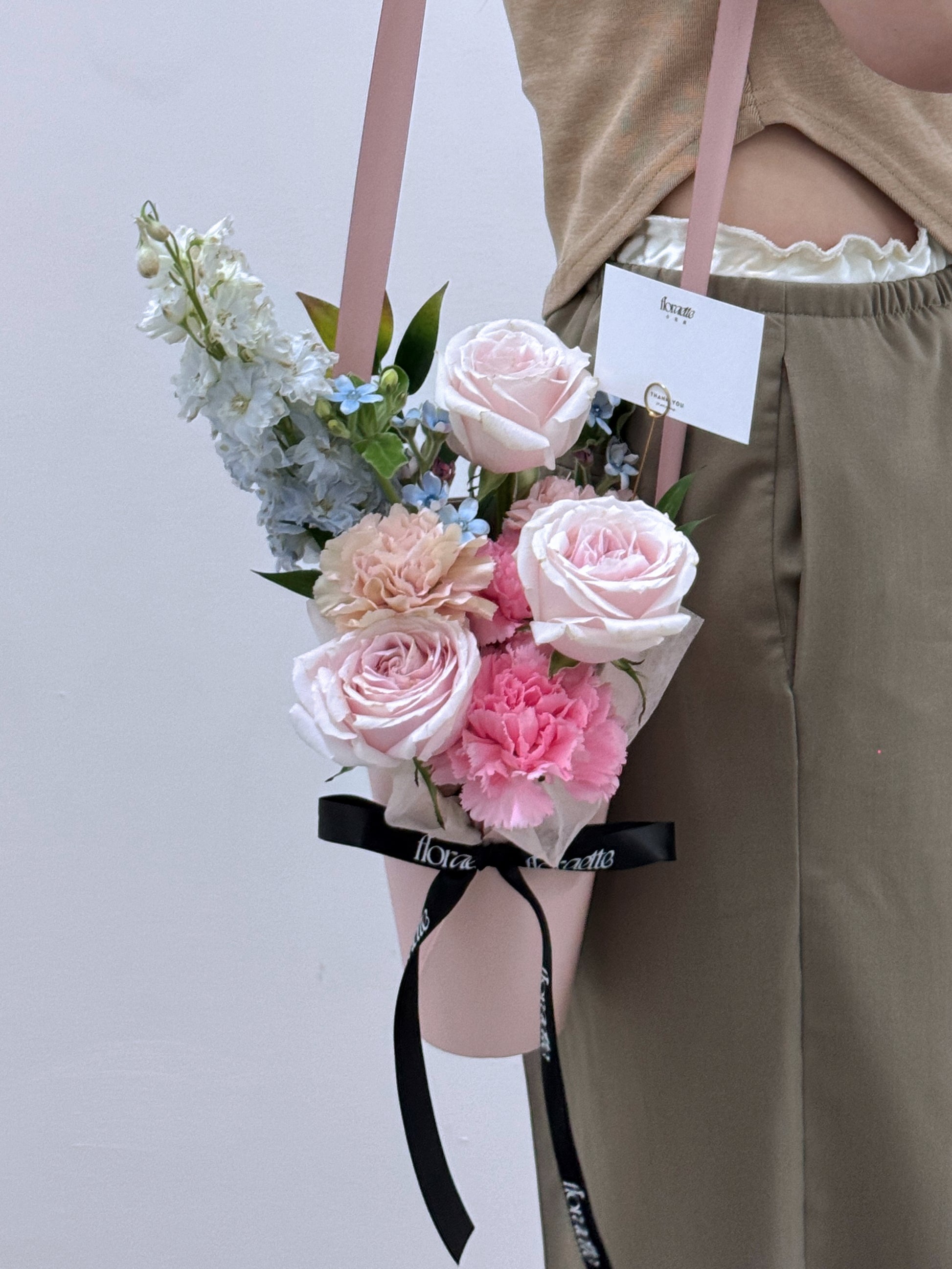 The paper flower tote bag embodies a harmonious blend of cappuccino roses, delphinium and carnations from Holland, complemented by exquisite foliages from the Netherlands.