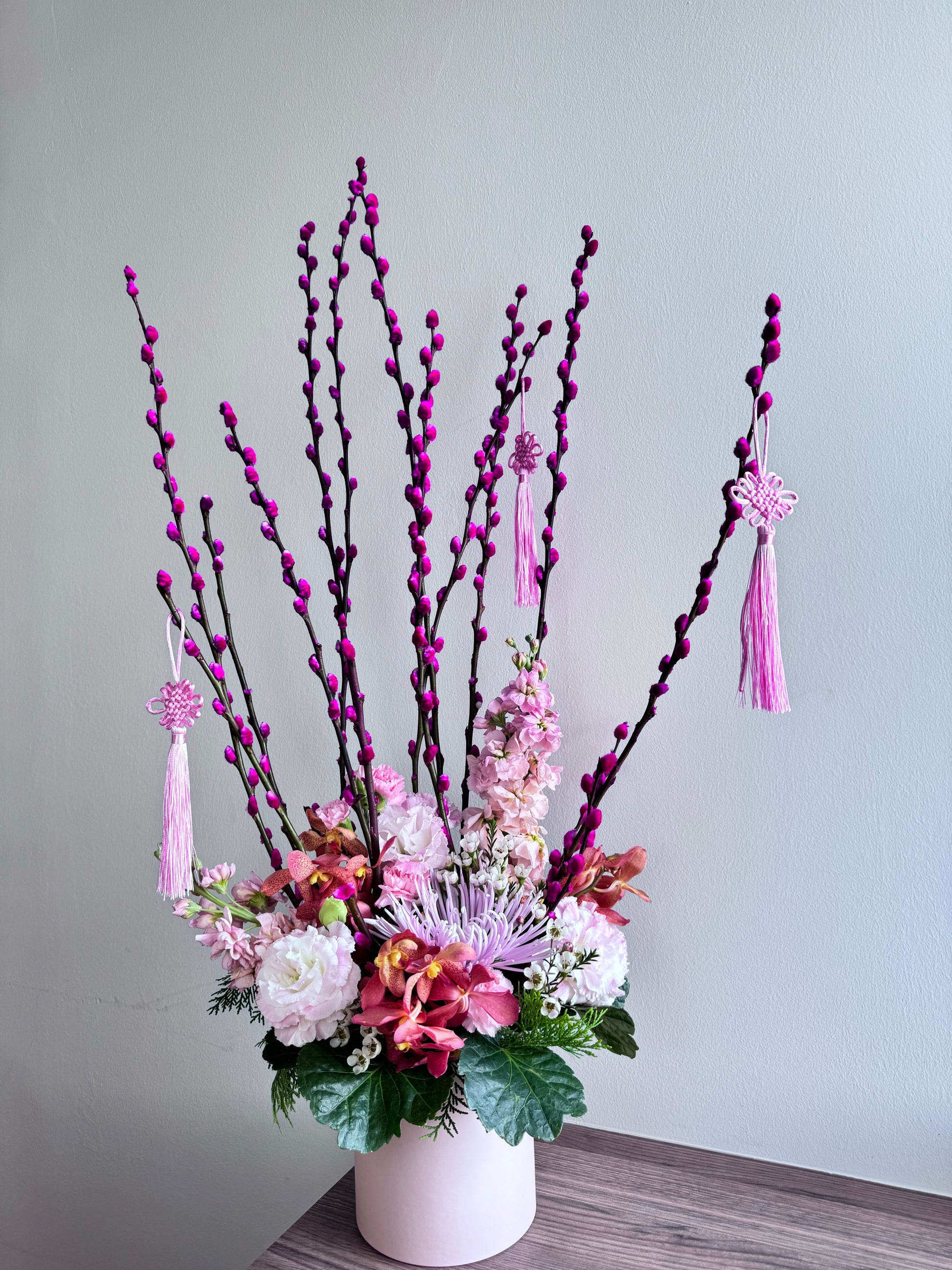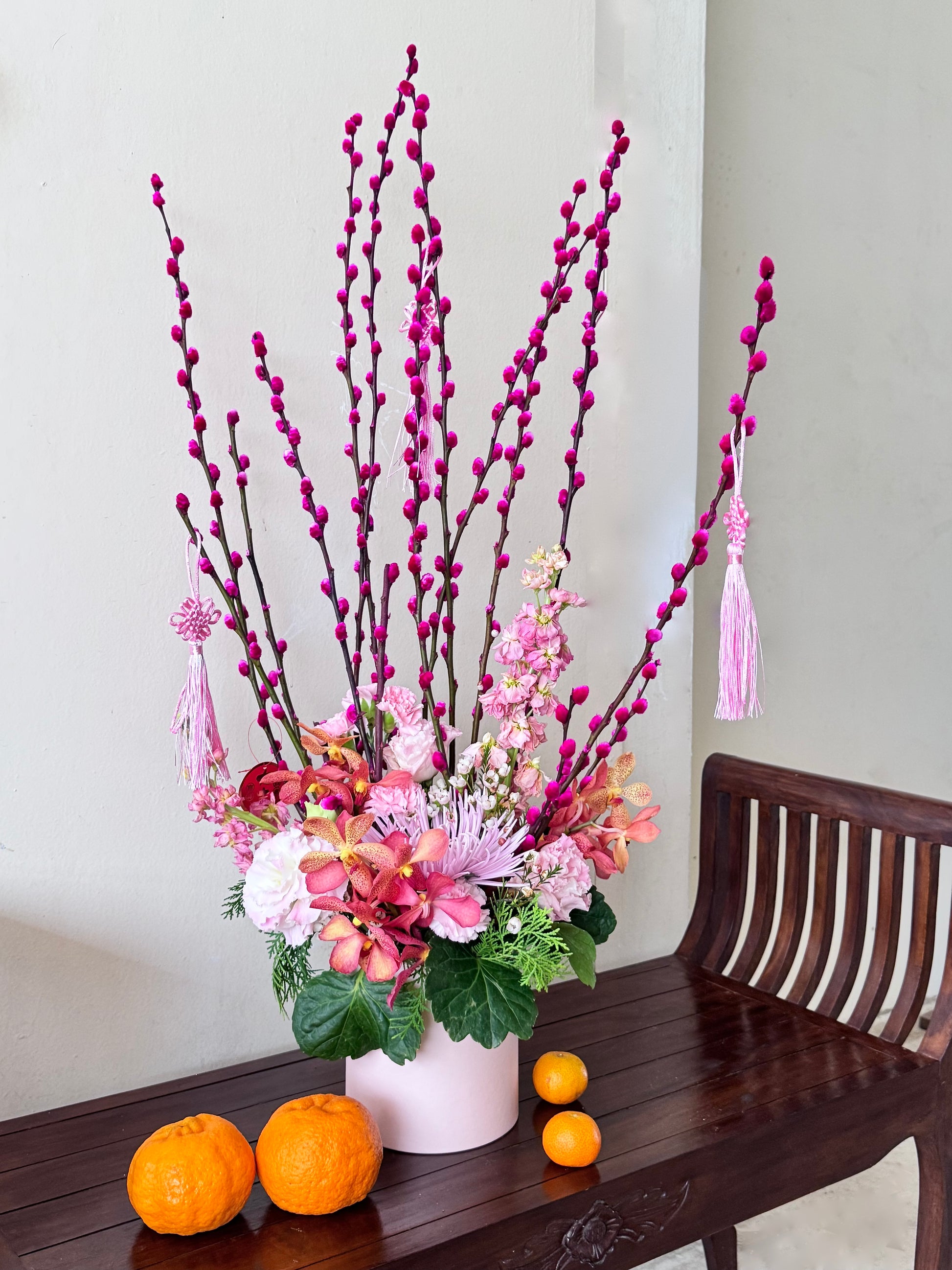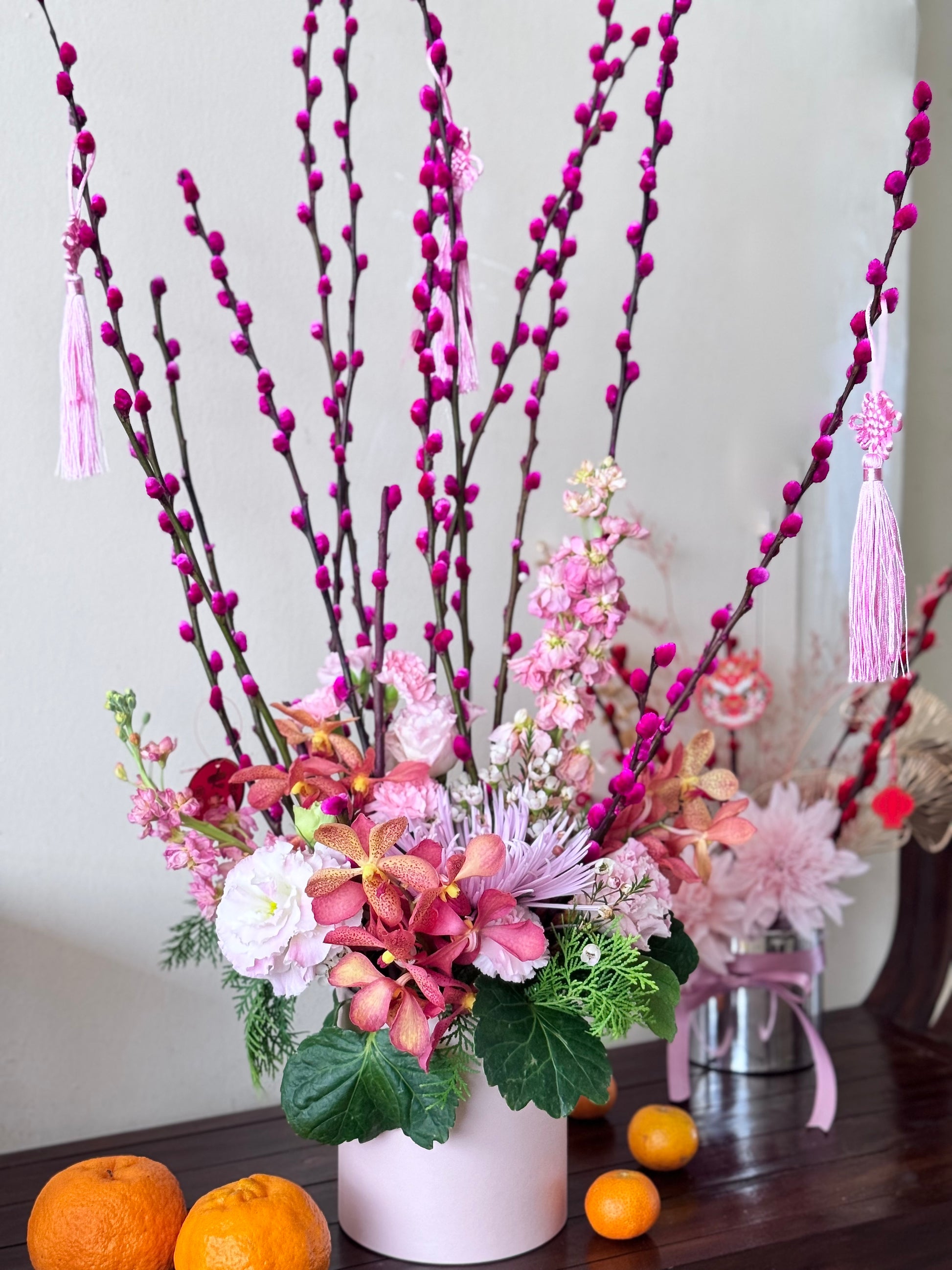 Flowers include Eustomas, Mokara Orchid, Matthiola, Anastasia Chrysanthemum and other filler flowers. We carefully selected the gorgeous large and blush colours flowers. Accompanied with our favourite Japanese chrysanthemum ; its petals symbolise of longevity, rejuvenation and nobility.