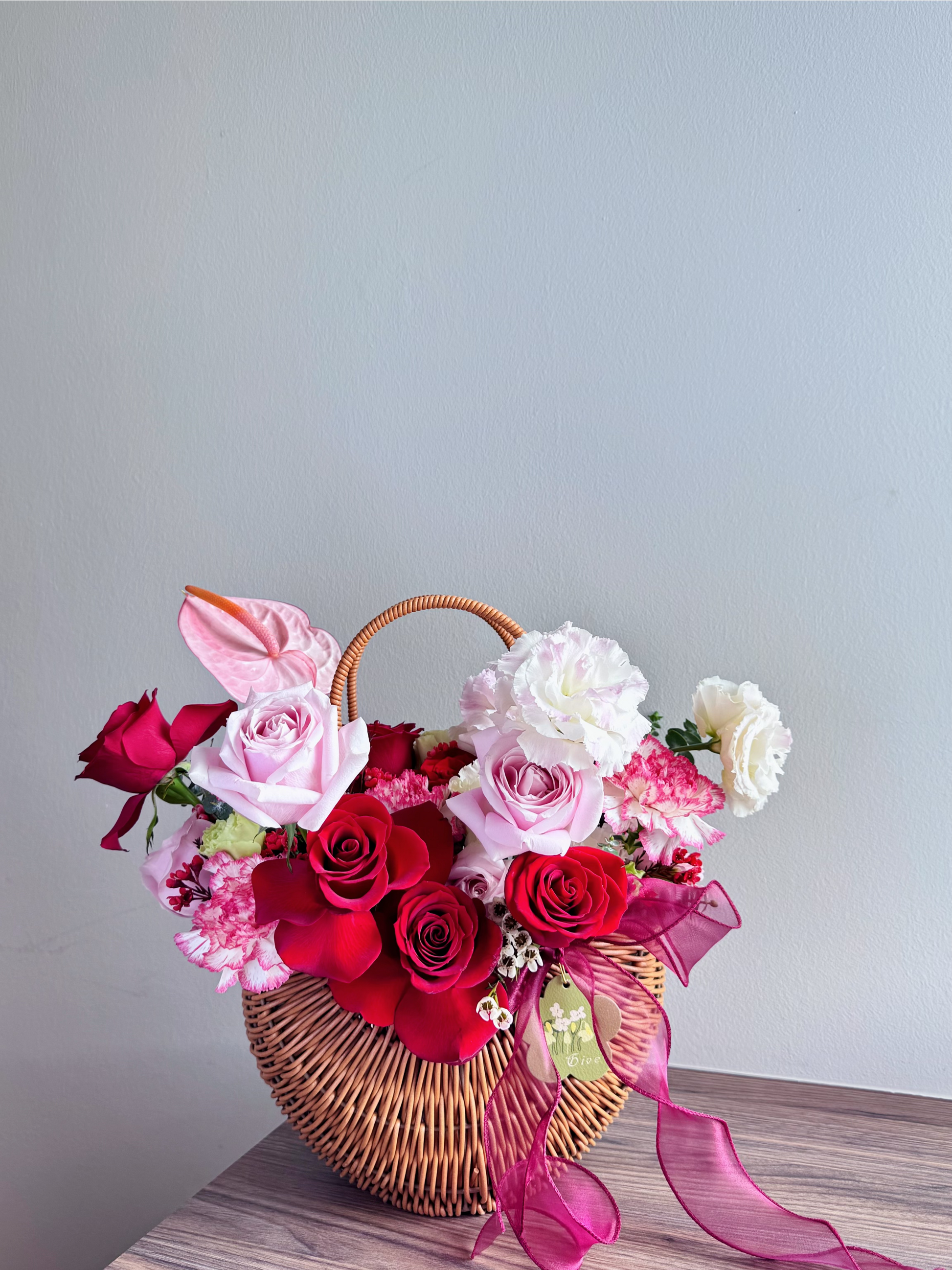 Elevate your Valentine's Day gift with our Love Blossom Basket. Bursting with vibrant Eustoma, Roses, and Carnations, this basket also includes delicate Wax Flowers and Eucalyptus for an added touch of romance. With Anthurium and Carnation Sprays, this love basket is the perfect expression of your affection.
