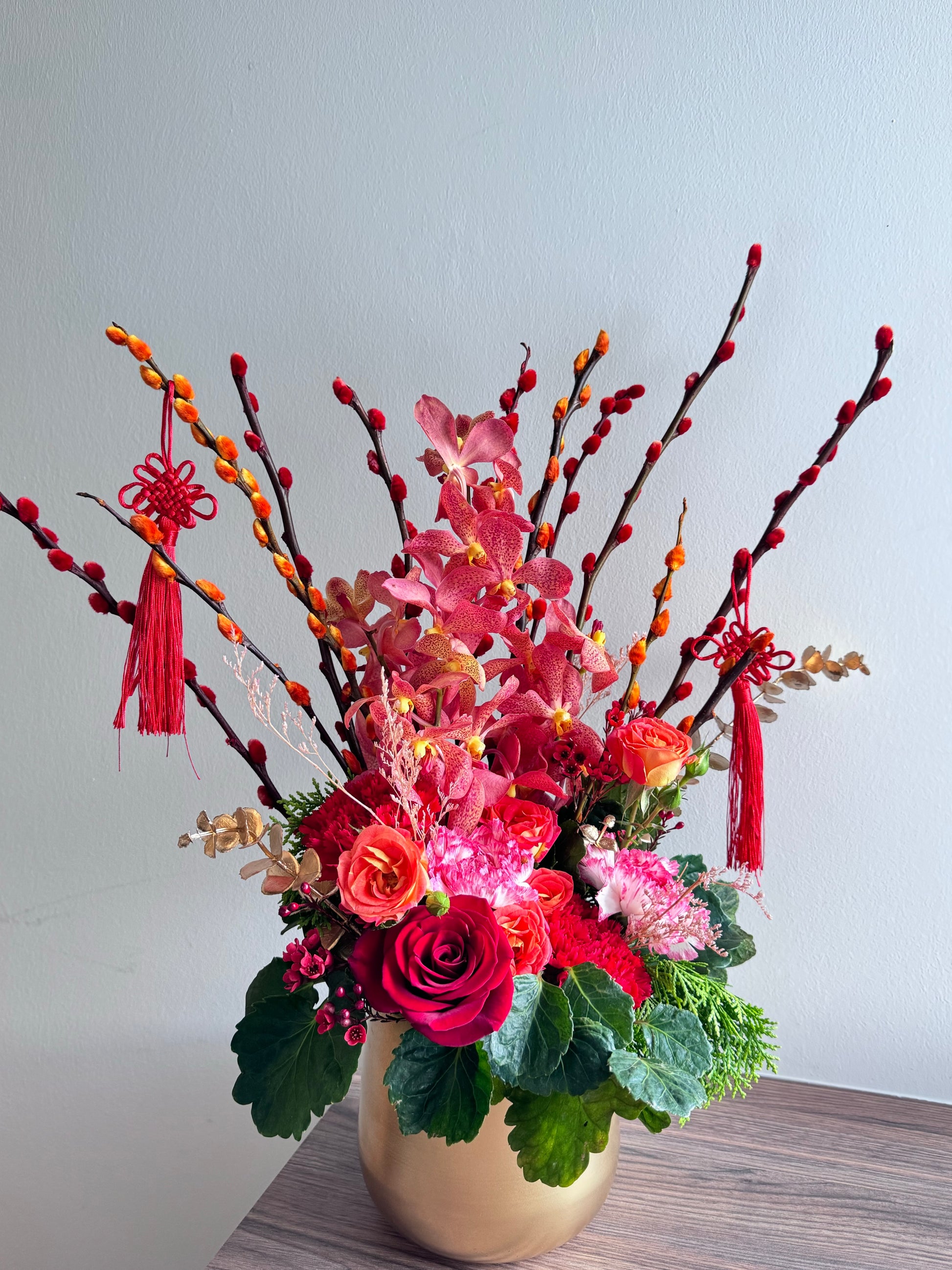 Specially curated for Chinese New Year, this gorgeous mix of red and orange hues entails red mokara orchids, pussy willows, red/orange roses, and artificial gold foliages. Paired with the intricate golden vase, this beautiful arrangement is a must-have to gift your loved ones this New Year. Send your warmest wishes with this artistically curated floral masterpiece, a symbol of abundance joy for the festive occasion.