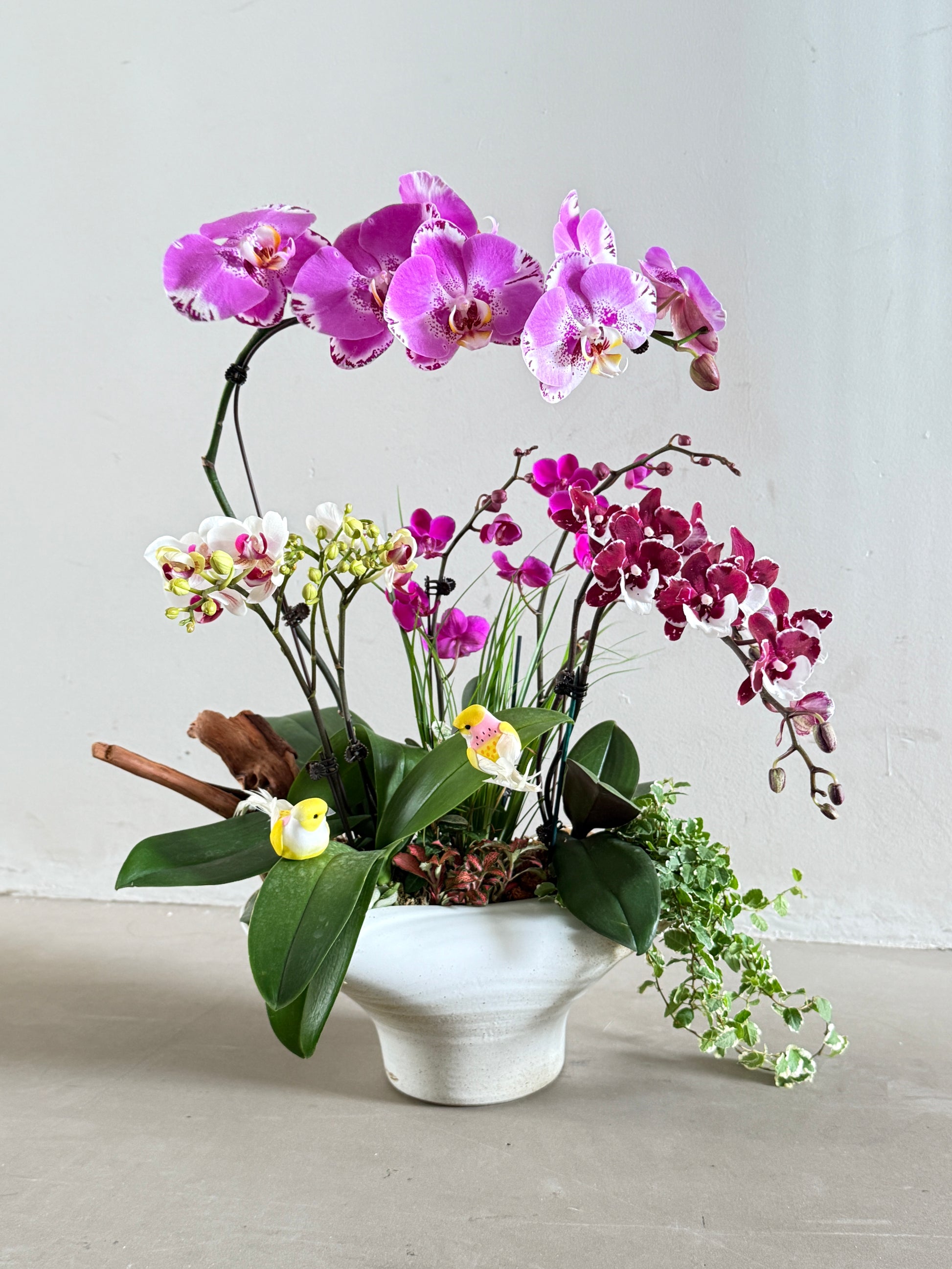 Elevate your space with the timeless beauty of orchids reimagined in a modern, artistic way. Our Orchid Symphony in Acacia features five exquisite tones of orchids, each chosen to create a graceful play of colour and elegance. Nestled amidst lush green foliage and presented in a handcrafted acacia wood pot, this design radiates natural sophistication while blending seamlessly into any décor style.