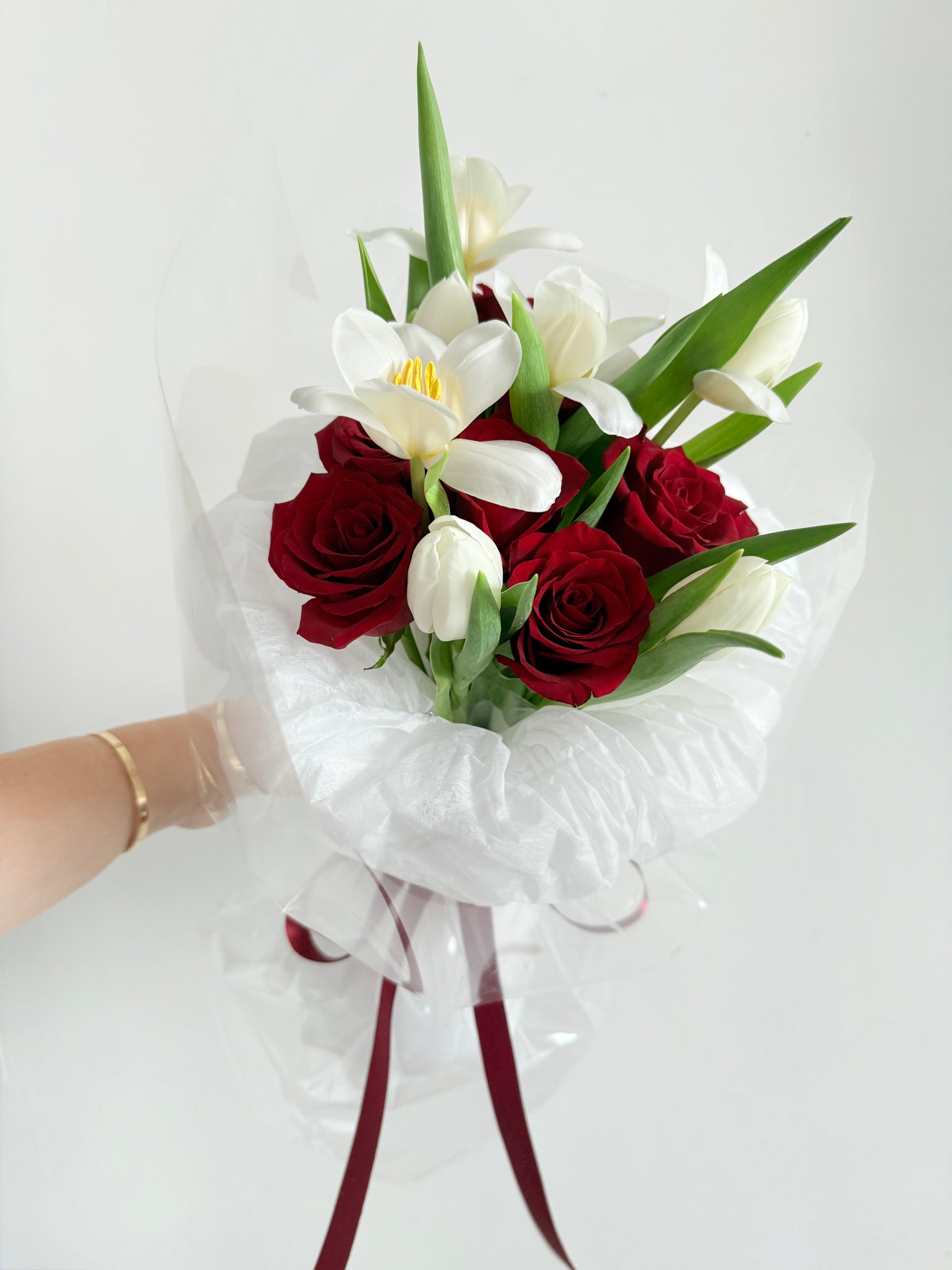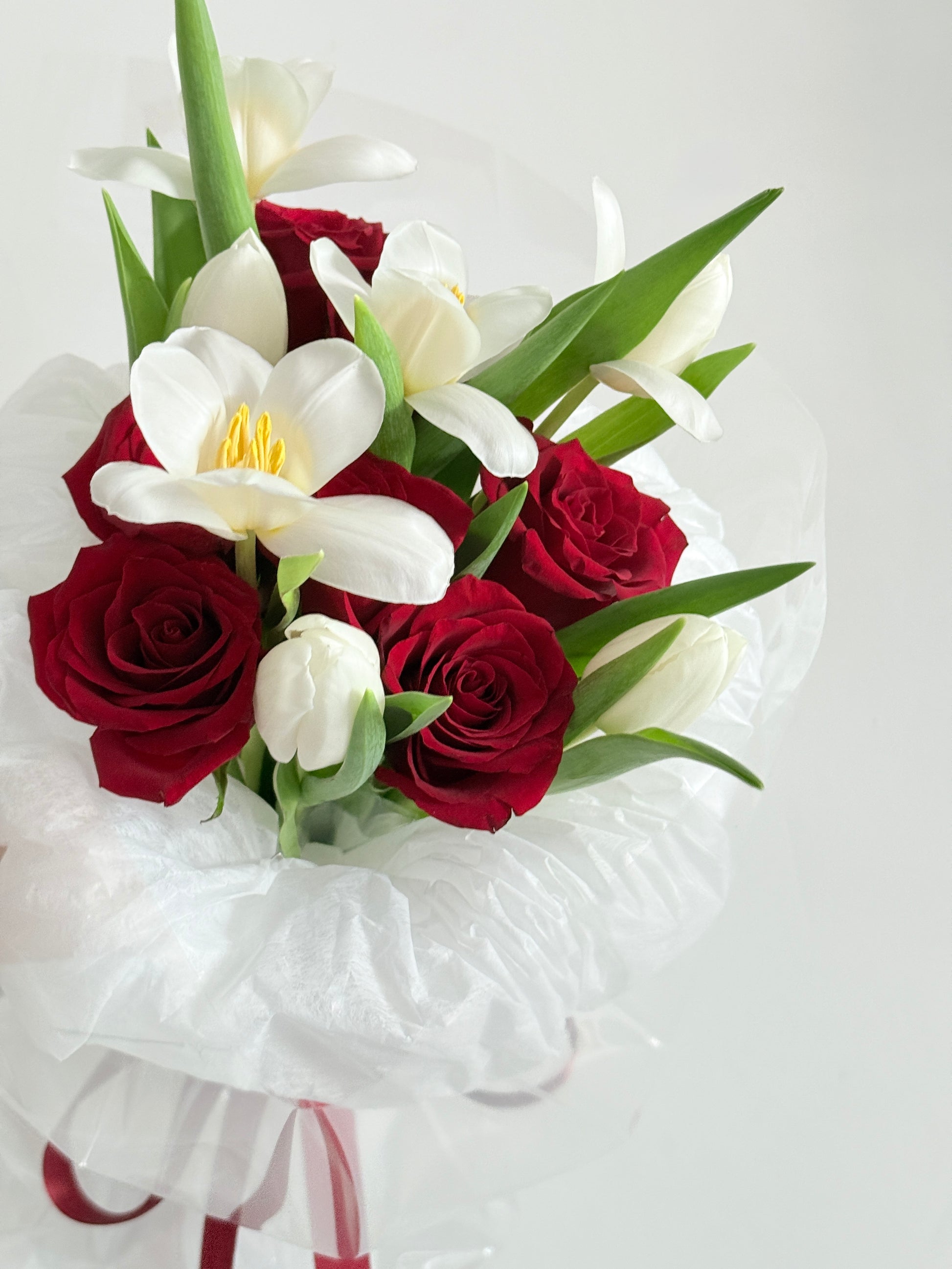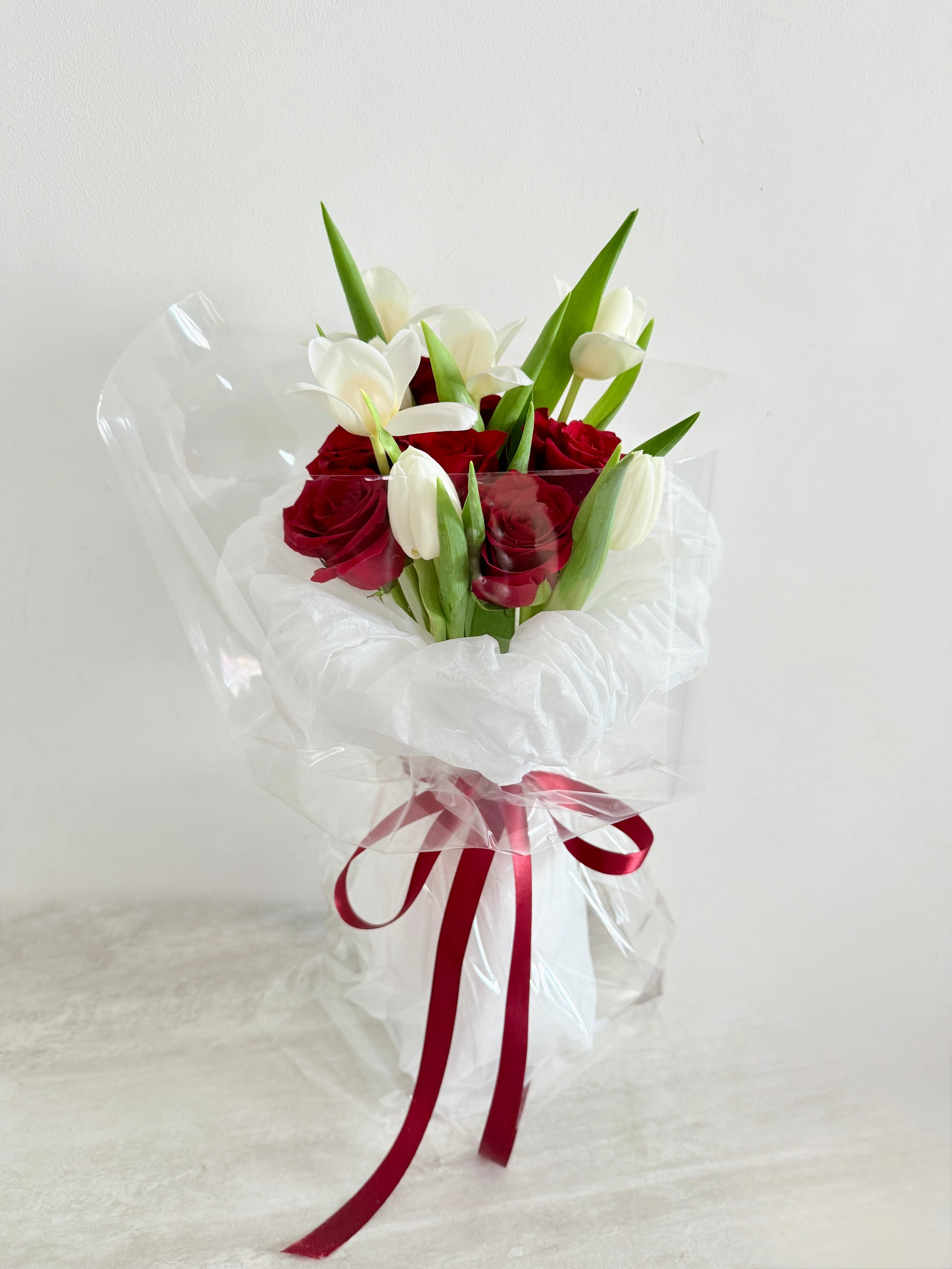 A timeless blend of soft, romantic tulips and classic, elegant roses, it is the perfect bouquet to express your deepest emotions. This delicate arrangement combines the gentle curves of tulips with the lush, velvety texture of roses, creating a harmonious balance of beauty and grace. Ideal for Valentine’s Day, anniversaries, or just because, this bouquet whispers love, admiration, and thoughtfulness.