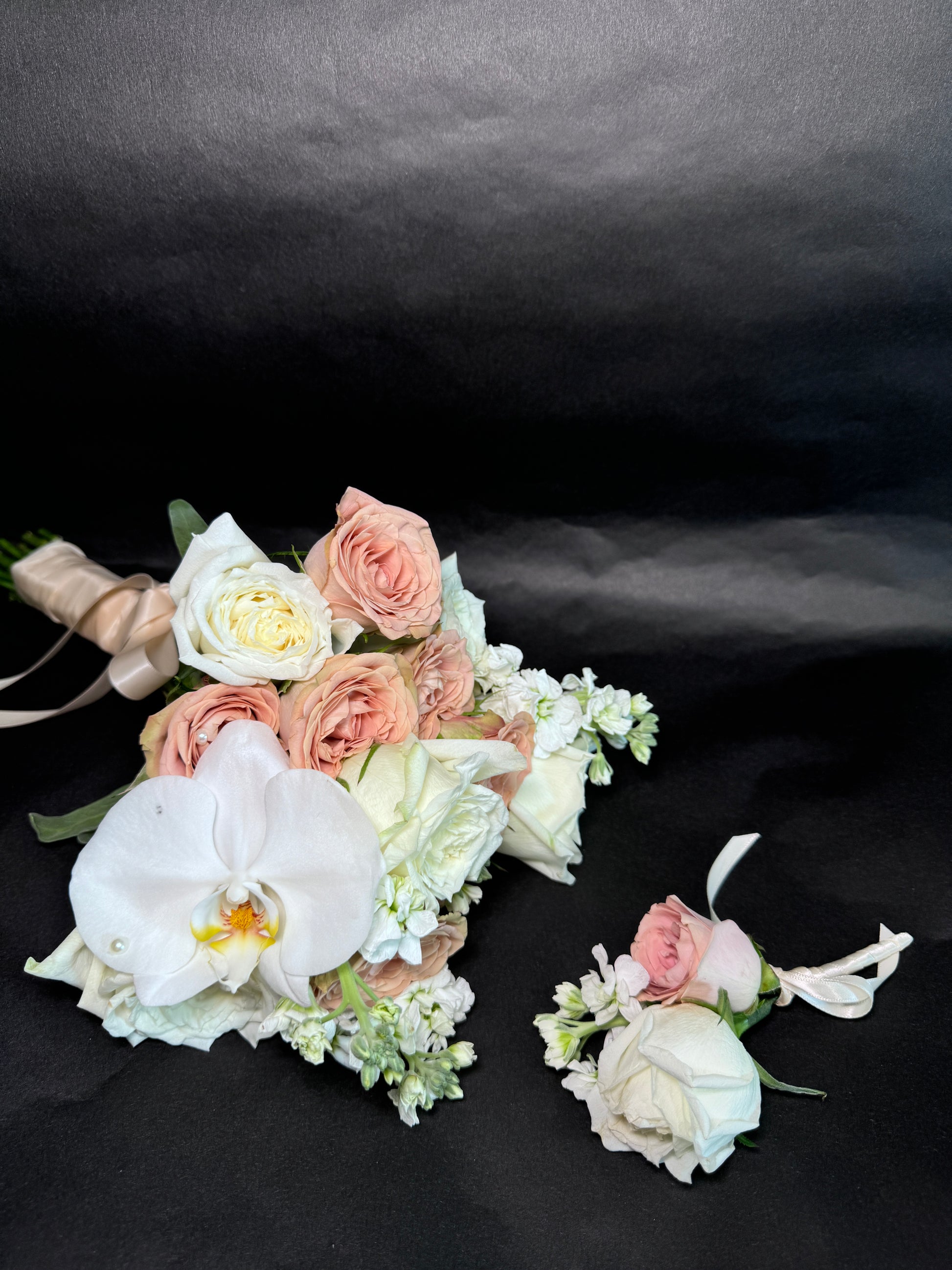 The Soft Blush Bouquet & Boutonnière Set is the perfect combination for a timeless and elegant wedding look. The bouquet features a soft blend of cappuccino roses, ivory blooms, and a striking white orchid, exuding romance and sophistication. Paired with a matching boutonnière, this handcrafted set is designed to create a harmonious and coordinated appearance for the bride and groom. The delicate hues and luxurious flowers add a touch of classic beauty to your special day.
